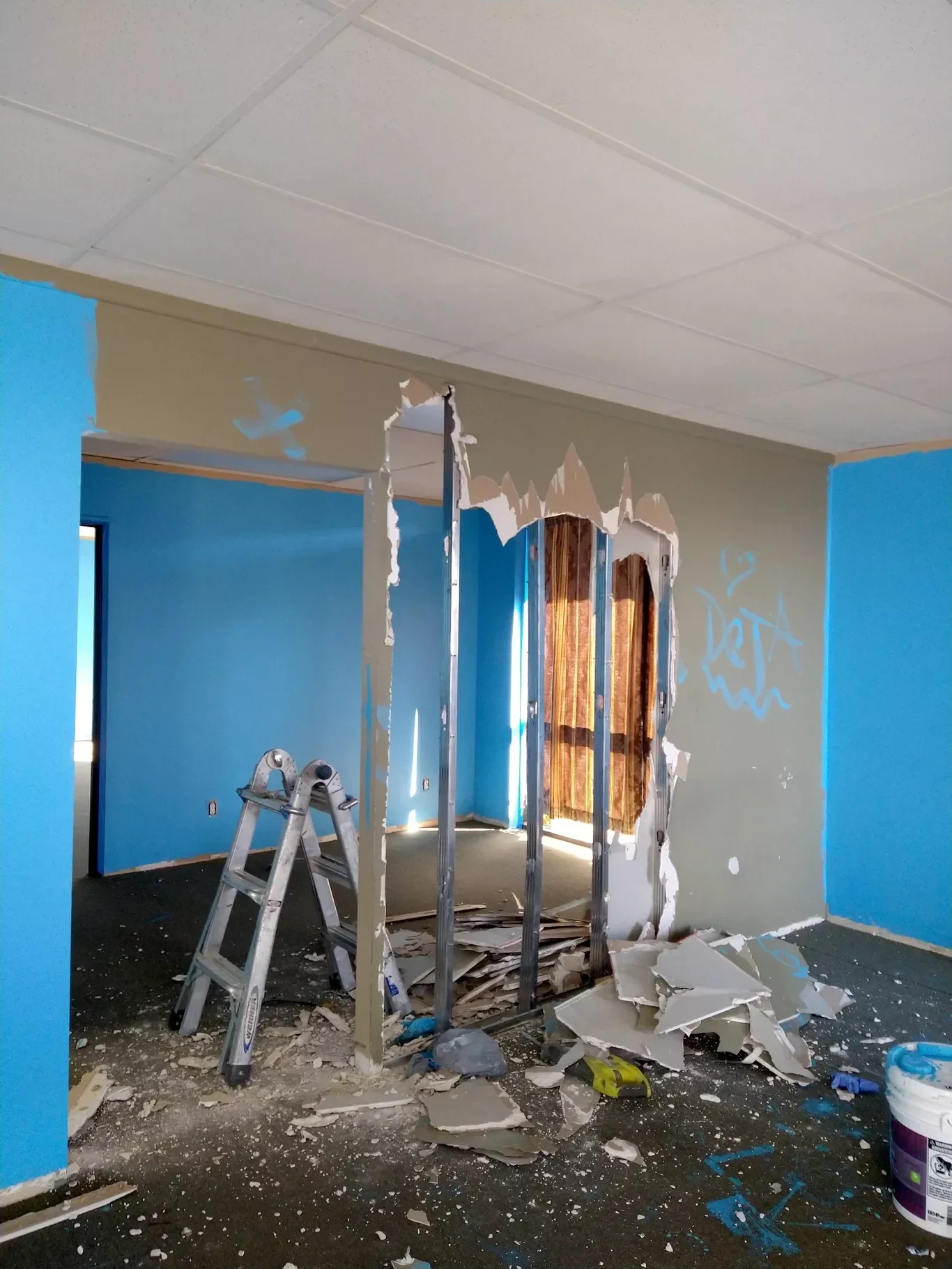 METAL FRAMING REMOVAL AND PONY WALL TO UPGRADE OFFICE SPACE.